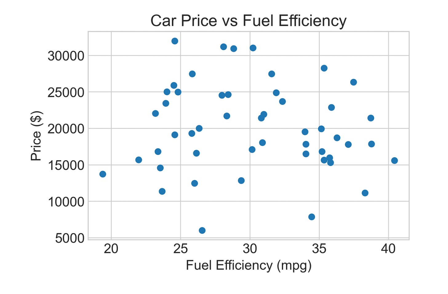 We can go to two dimensions, such as age and weight, and now we’d plot that on a 2D plane, aka x-y axes, aka cartesian plane. Here’s an illustration of the same shape (2 dimensions where each one is a positive real number) using fuel efficiency and price: