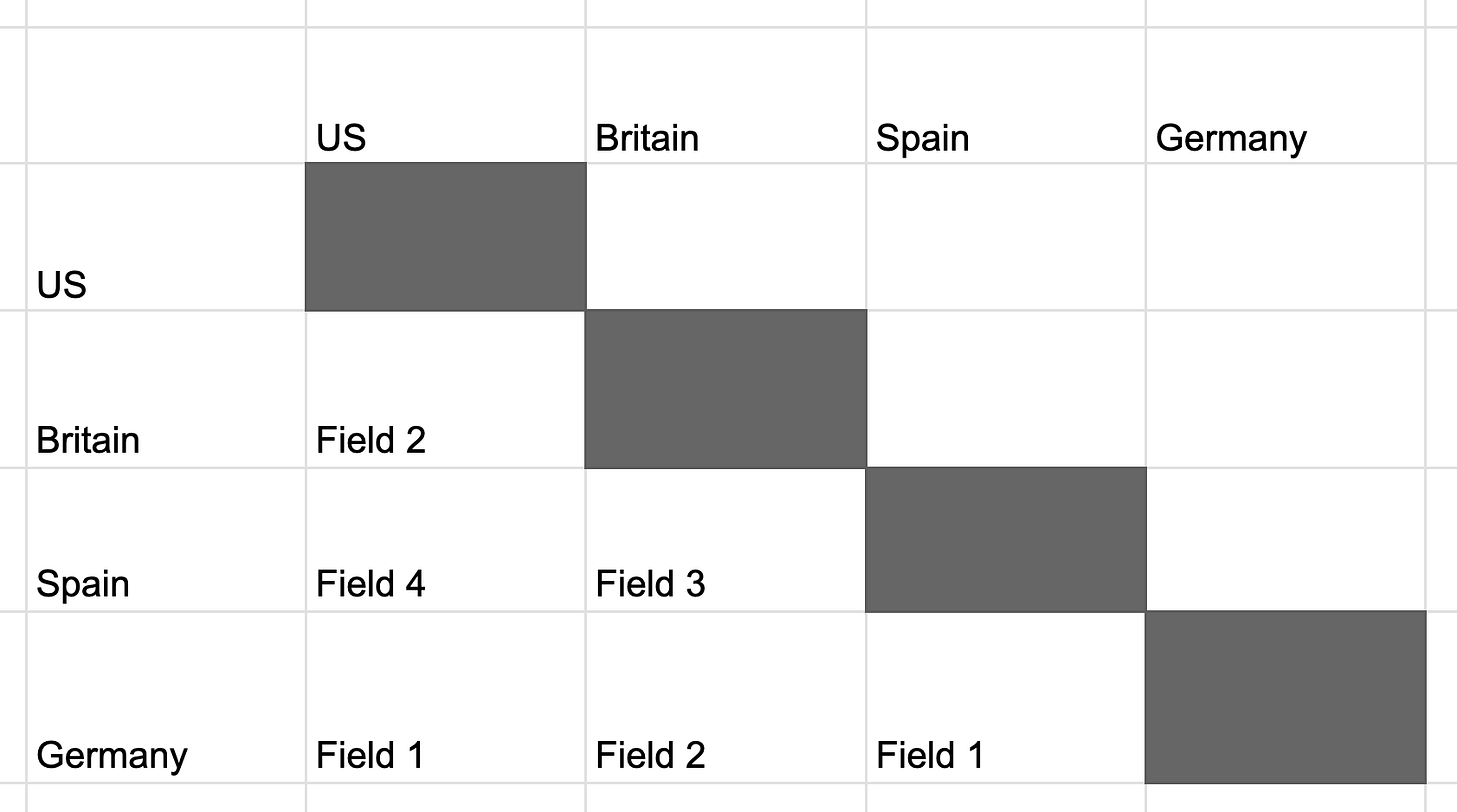 Another way to spice things up is to move from data sets where order matters into ones where order doesn’t matter. Consider all the games in a 4 team round robin where everyone plays everyone else once. If we think about just the games themselves, so like what field the game is played on as opposed to the individual team scores, then order doesn’t matter. The set of all games is the same as choosing an unordered pair of two teams. We end up with this triangle shape, which is like the 2D plane folded onto itself.